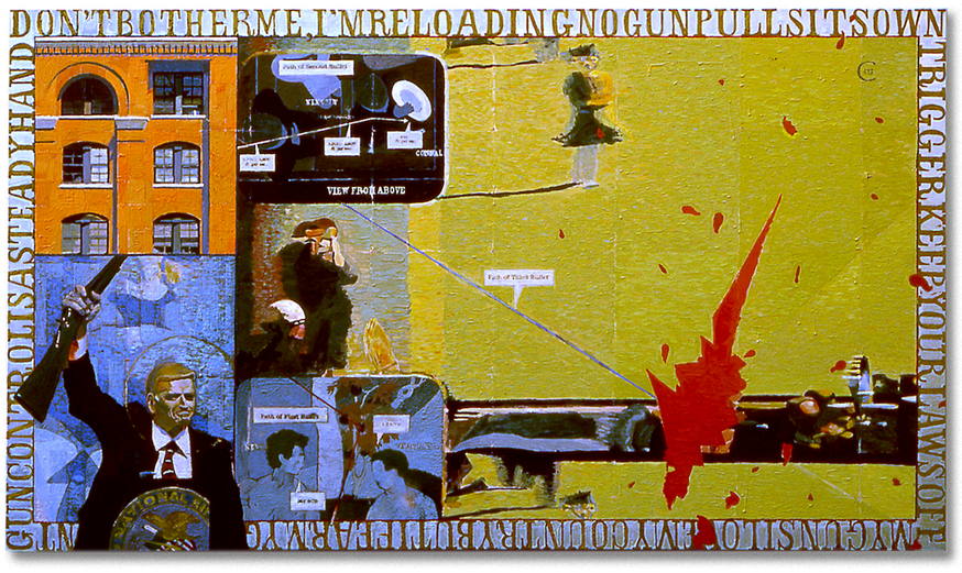 Frame 313 of the Zapruder film’s explicit record of the JFK assassination is the primary visual reference in this large encaustic work that is approximately 6 feet, 5 inches in length. Other imagery includes a reinterpretation of Albrecht Durer's 1504 engraving “Adam and Eve,” an infographic-style diagram, the Texas School Book Depository building and an unidentified National Rifle Association speech-maker. Using metallic enamel paint, the edges reproduce a selection of gun-related slogans commonly found on bumper stickers.