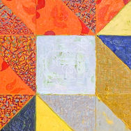 Based on a classic quilt pattern variously called a Carpenter’s Star or Carpenter’s Cross, this overt tribute to Henri Matisse focuses on his later paper cut-outs for inspiration. Several of Matisse’s cut-outs are referenced throughout the painting, including his four famous “Blue Nudes.”